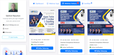 Setelah mendaftar, login ke akun yang sudah dibuat.  Klik tulisan Webinar Terbaru untuk melihat webinar yang bisa kita diikuti. Seperti contoh akun saya berikut ini.